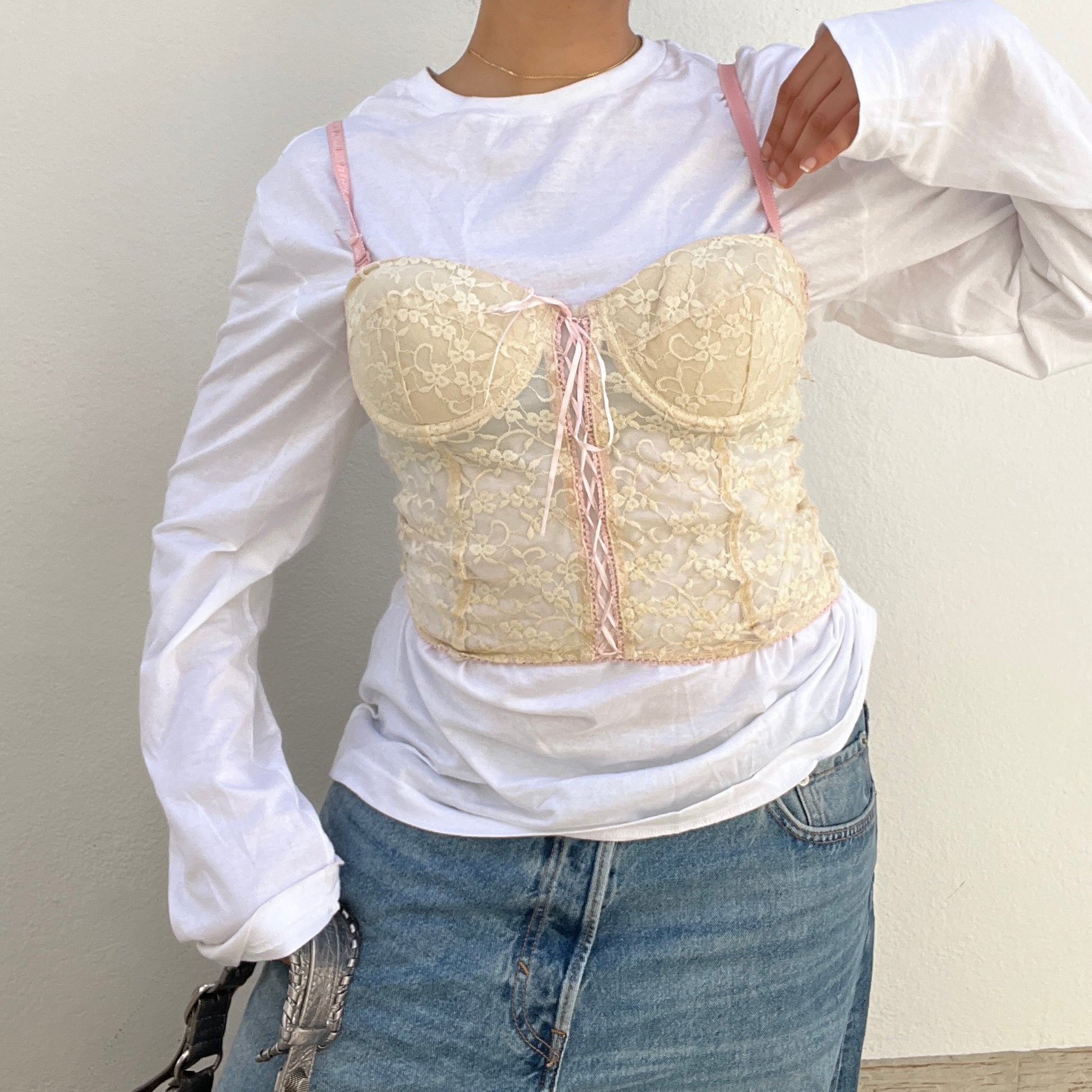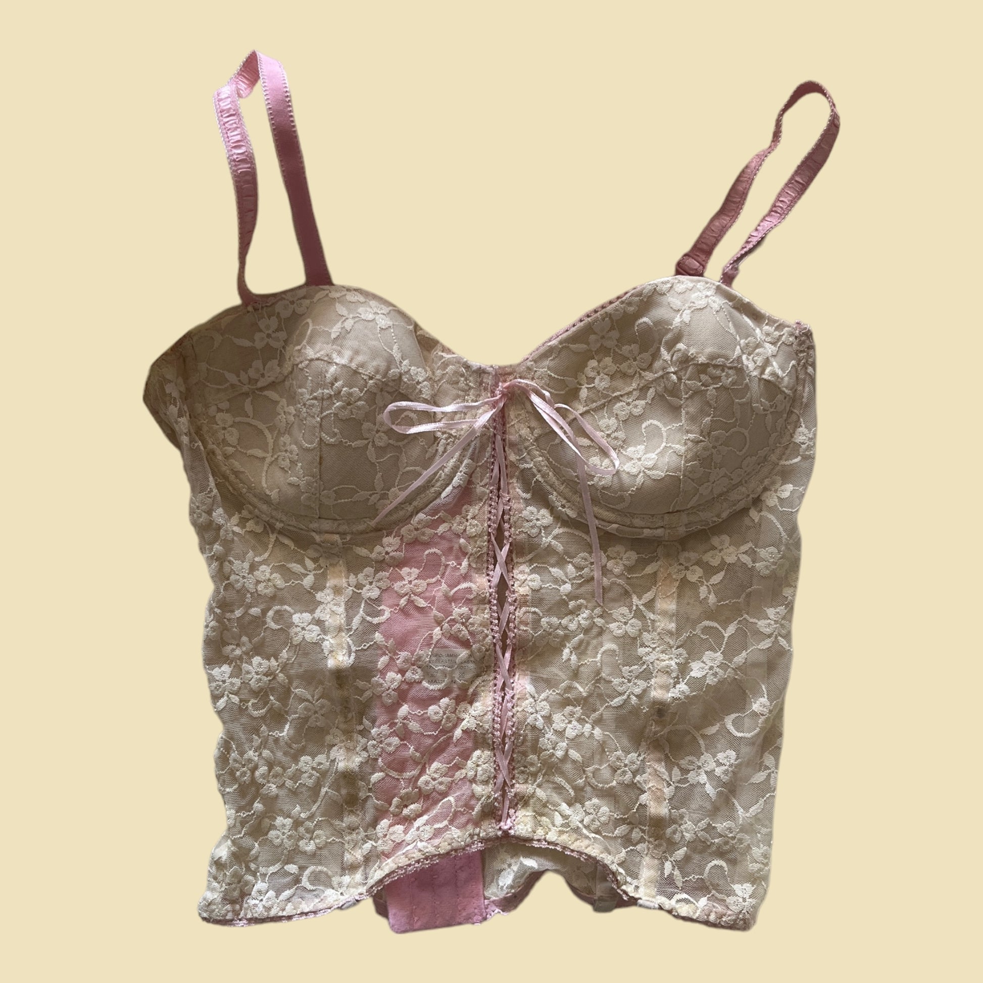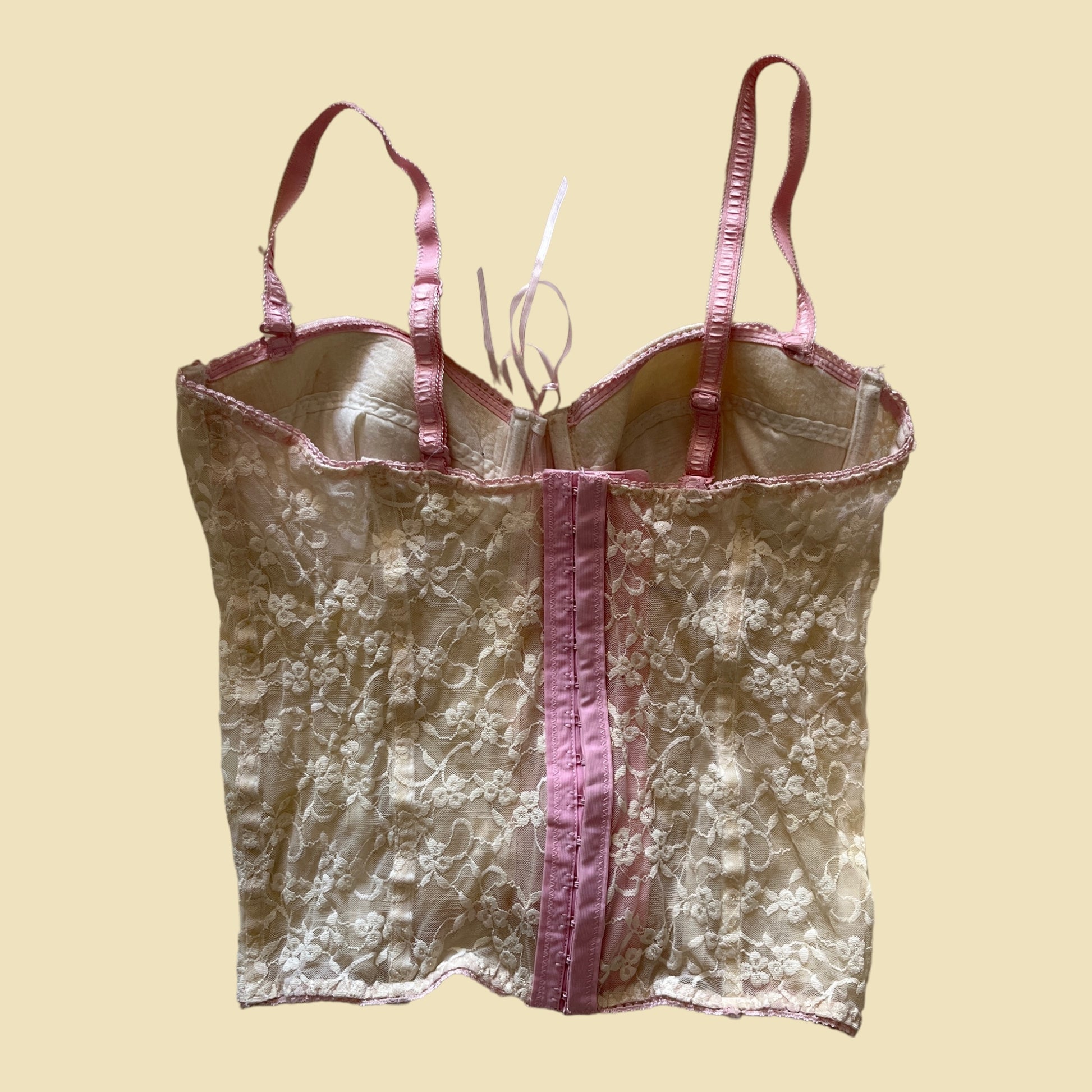 Corset bustier en dentelle beige et rose
