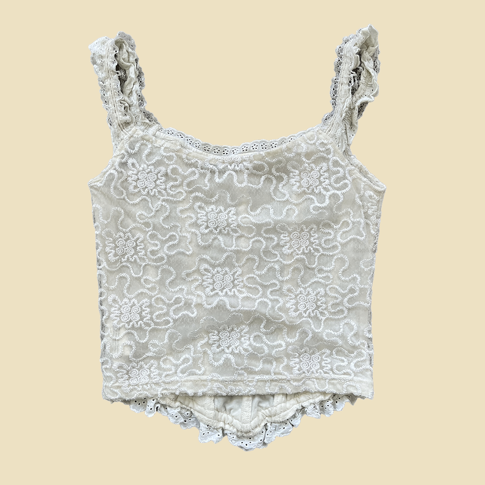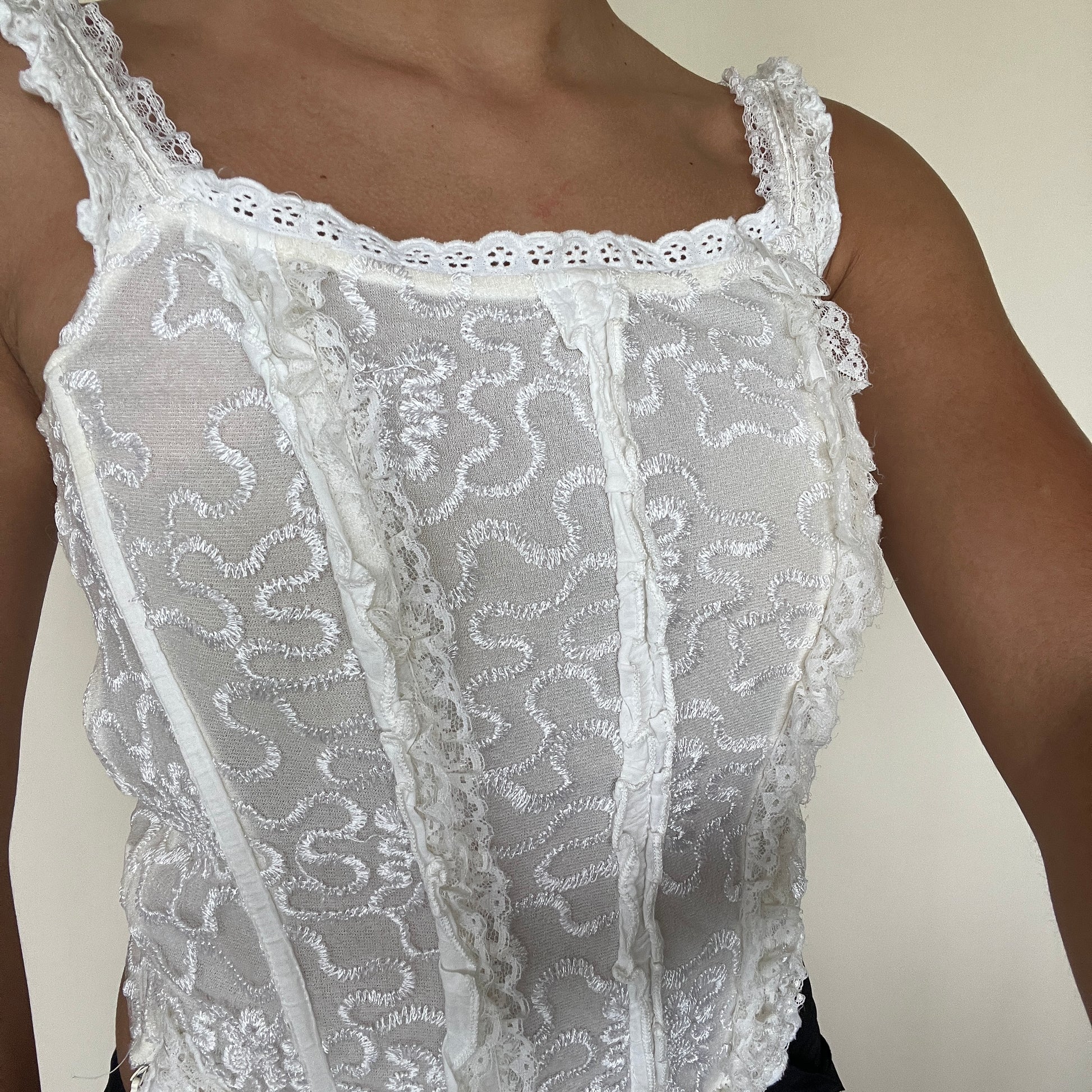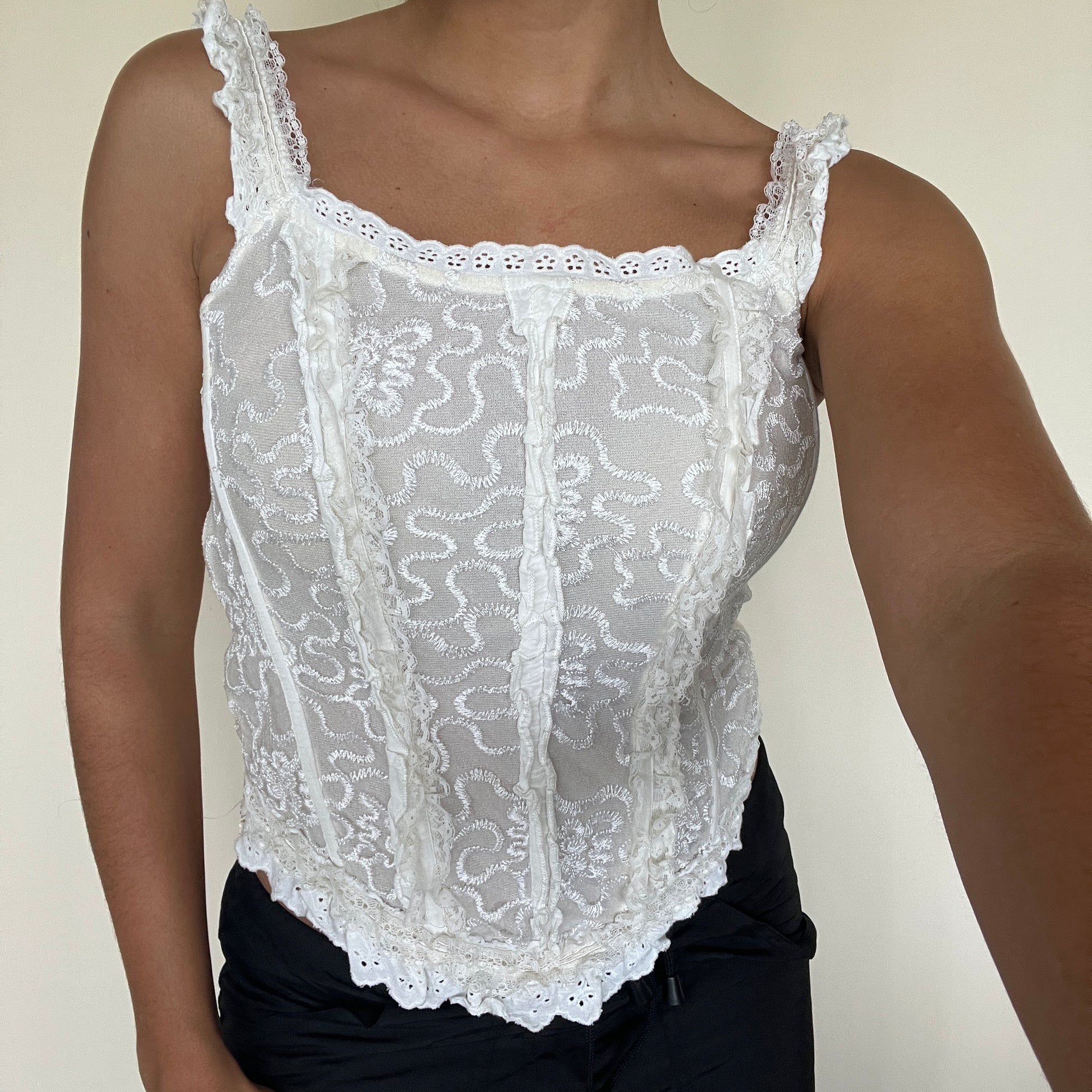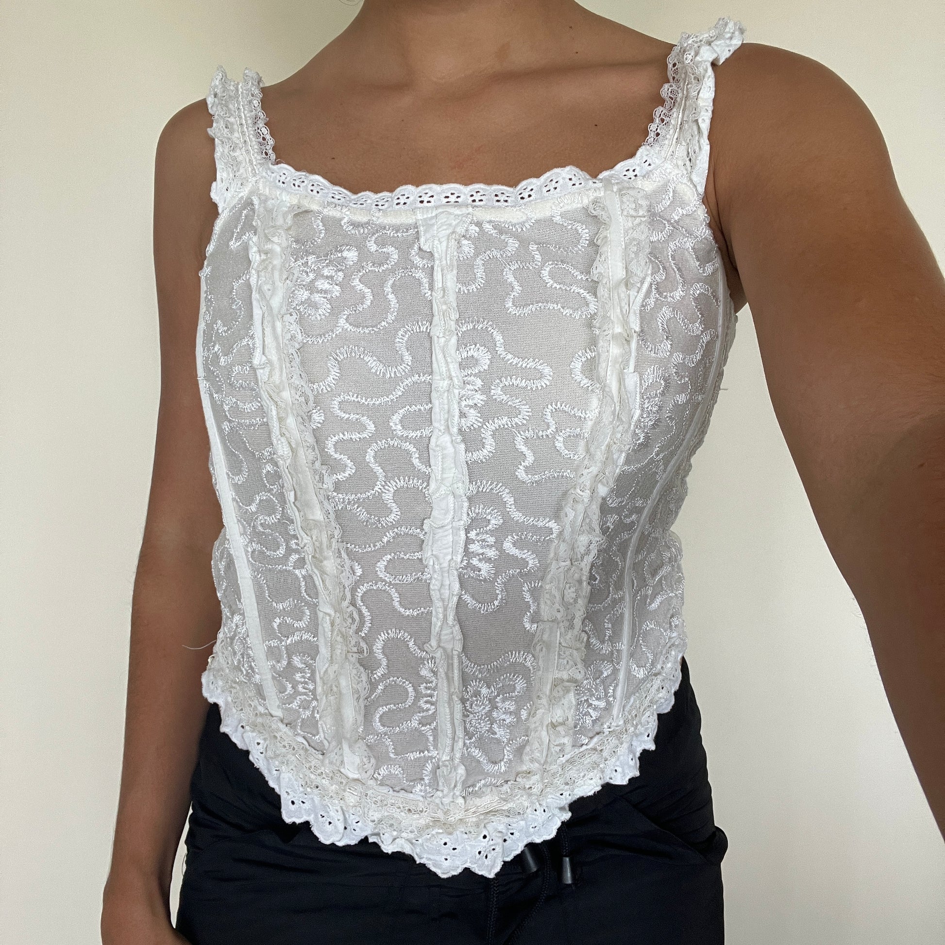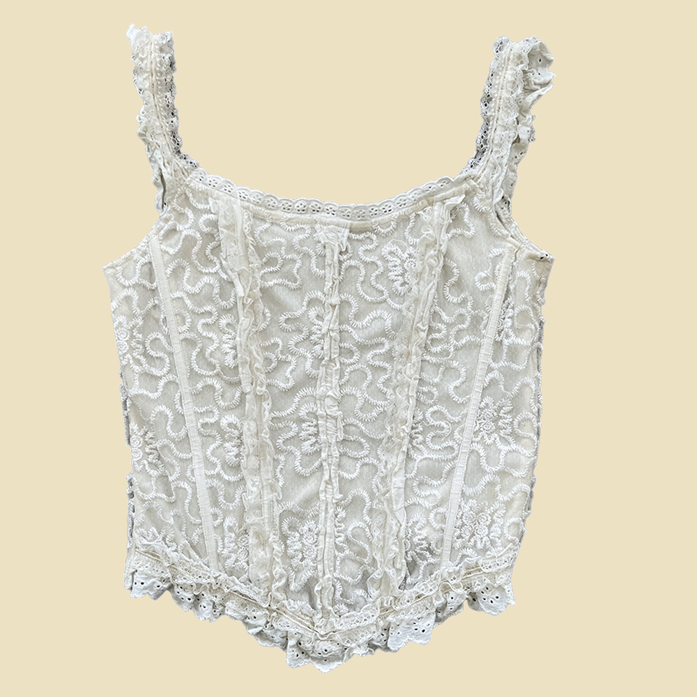 Corset Xanaka des années 2000. Motifs brodés et dentelles.