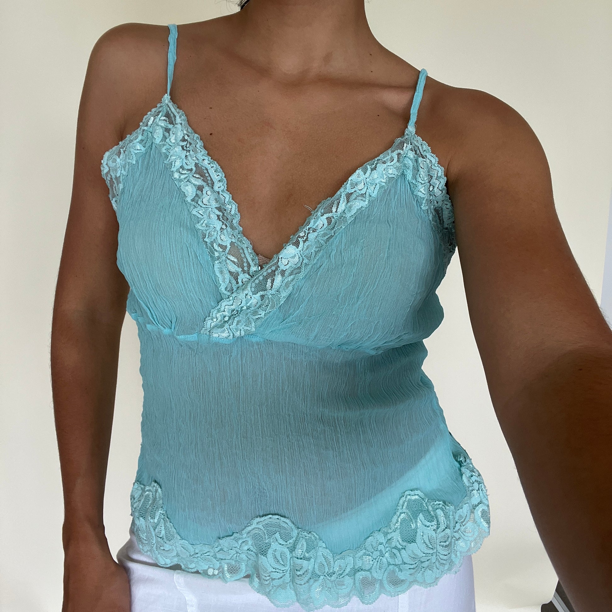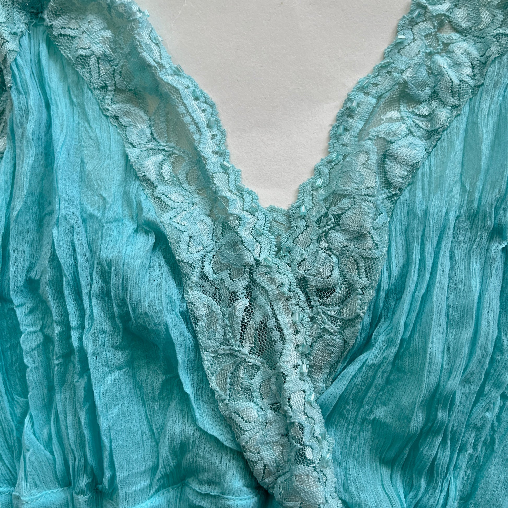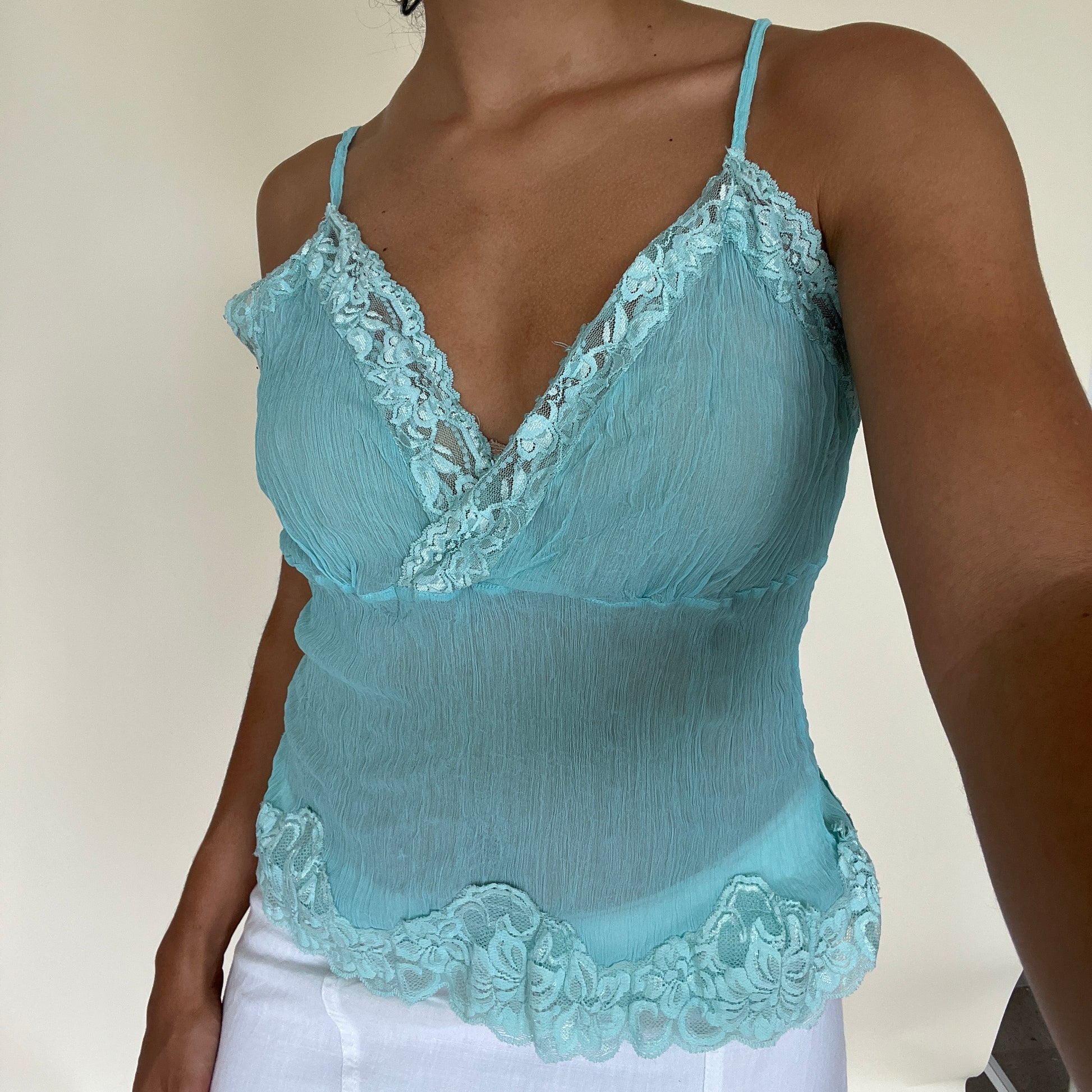 Top bleu turquoise en dentelle. Bretelles réglables.