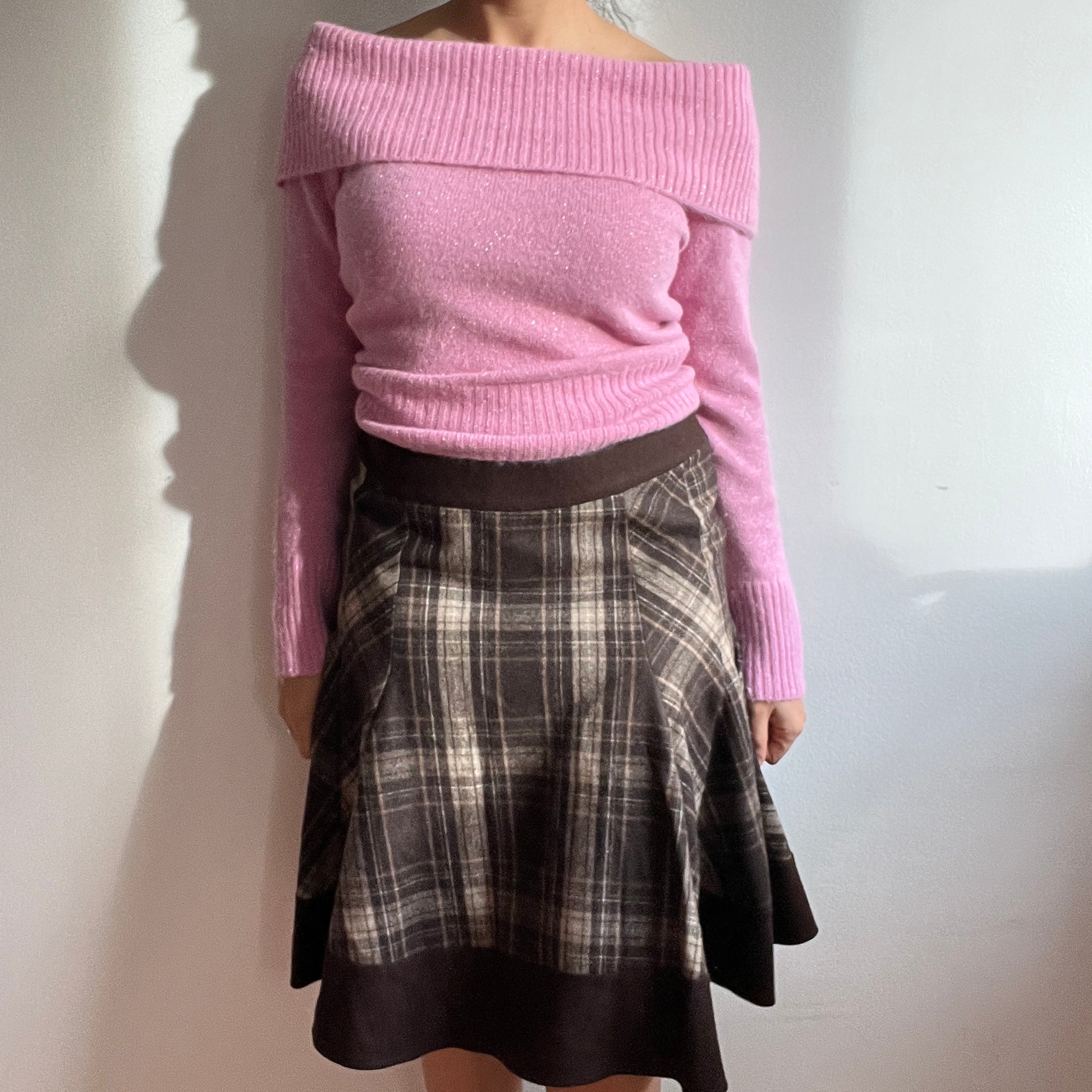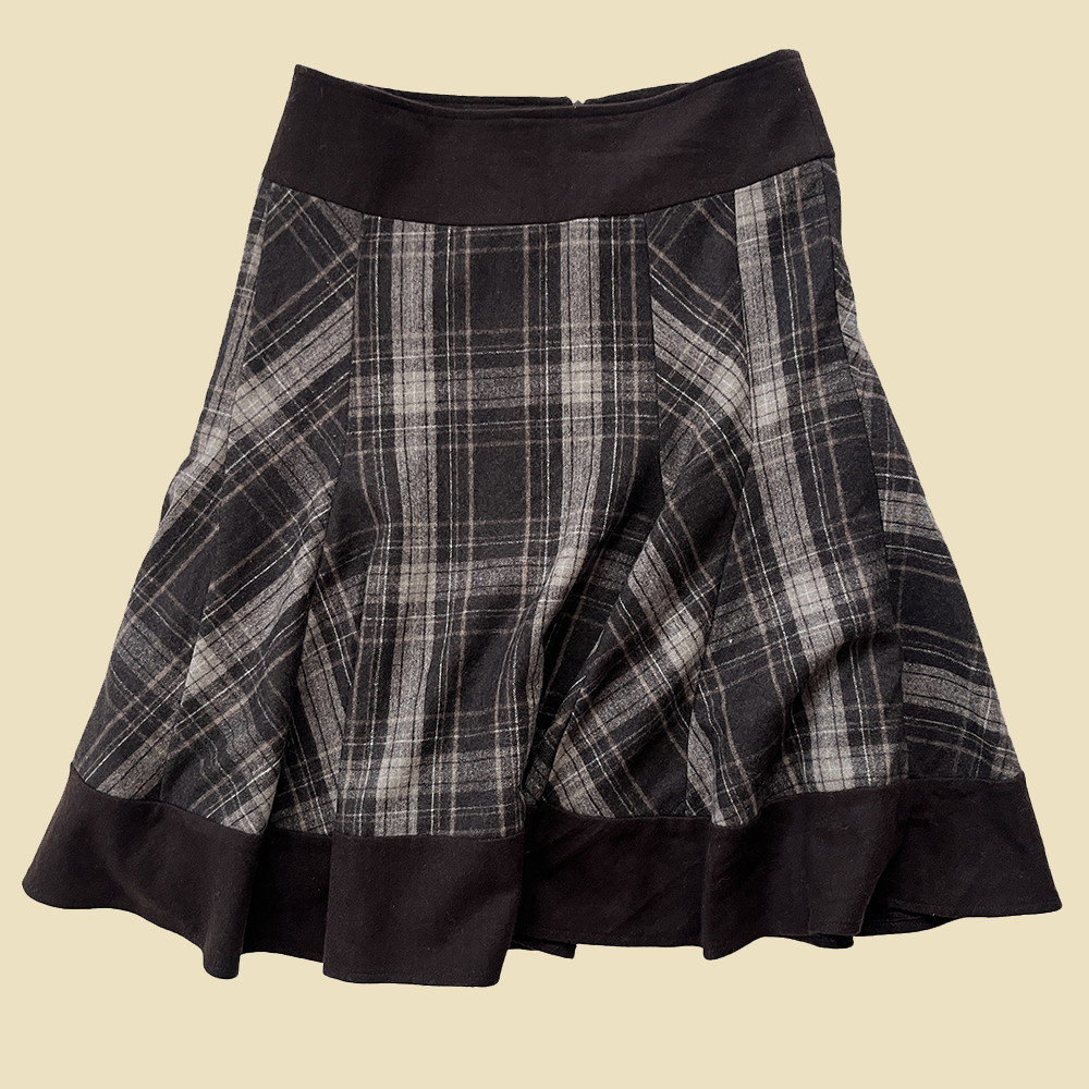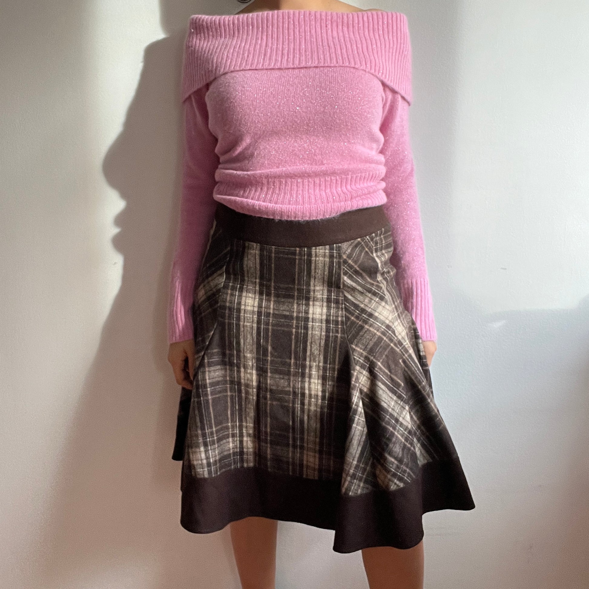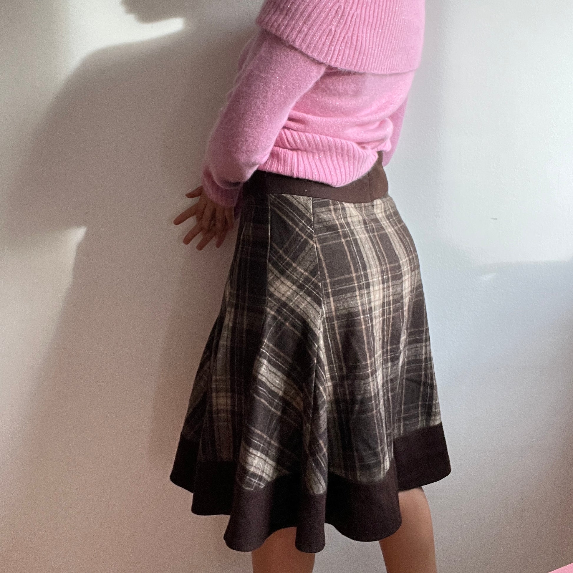 Jupe midi en laine à carreaux marron