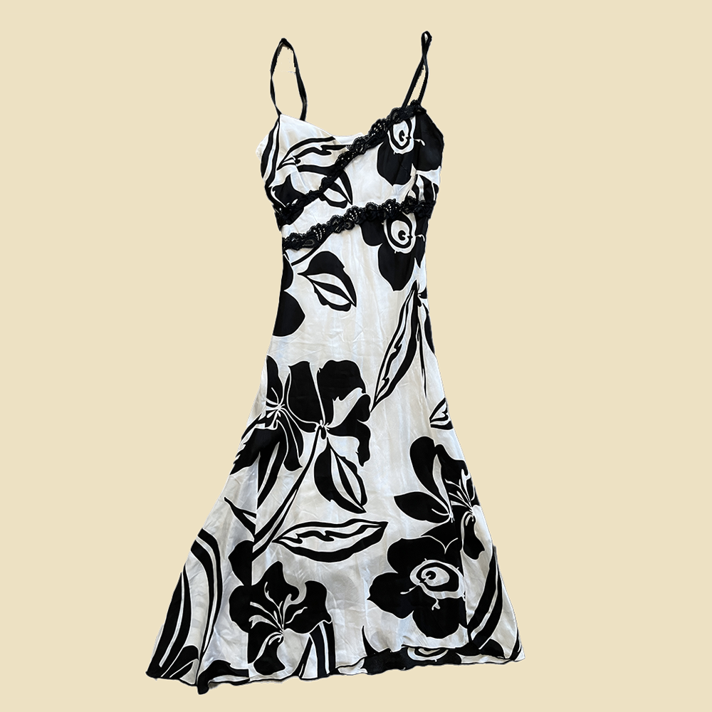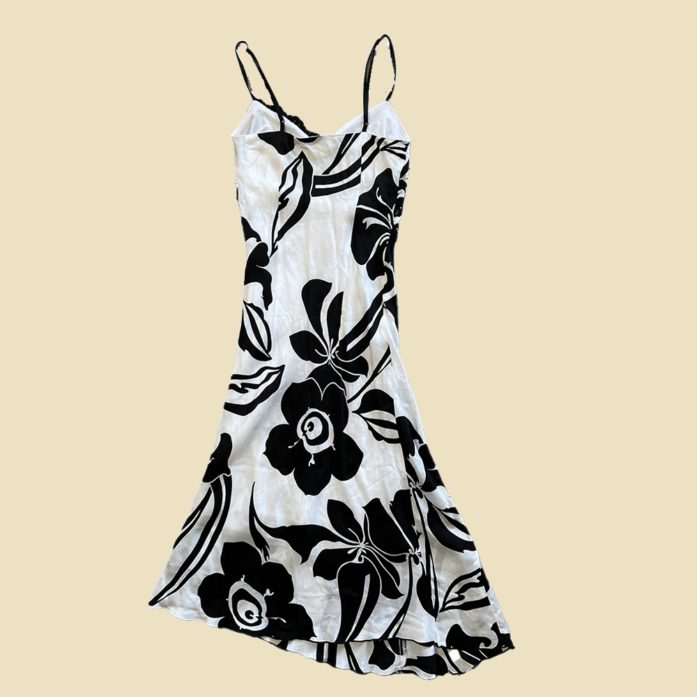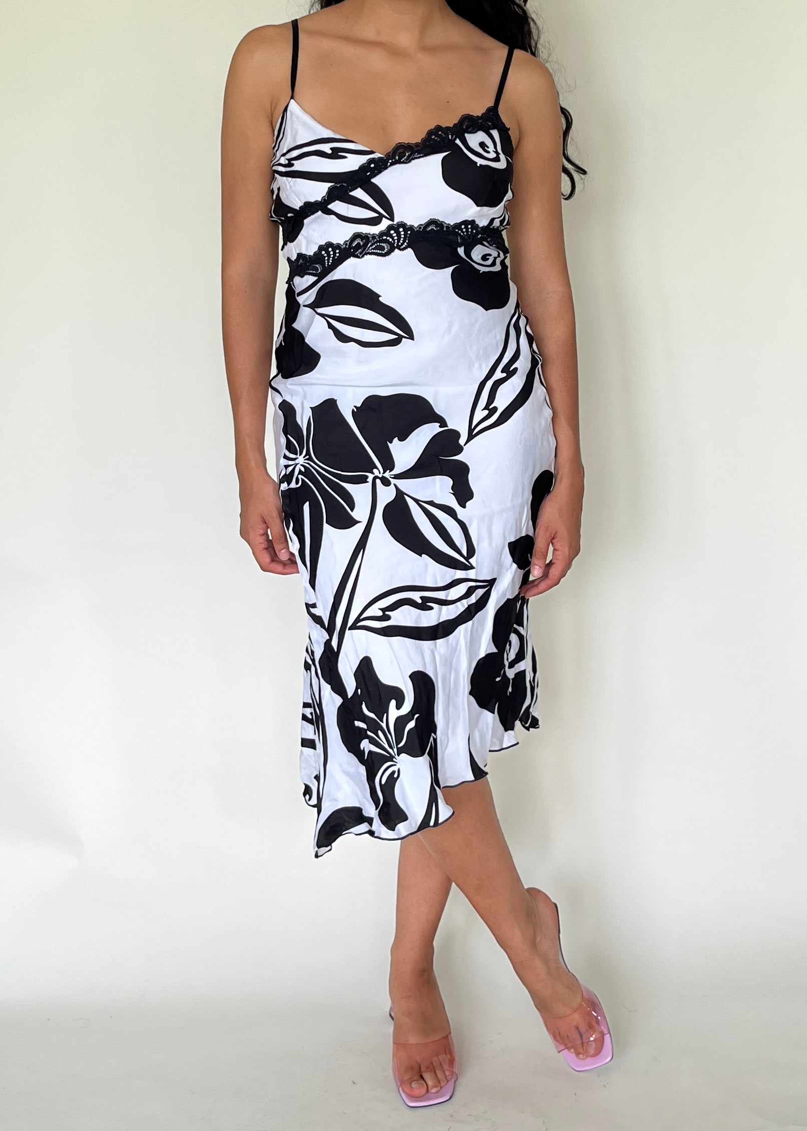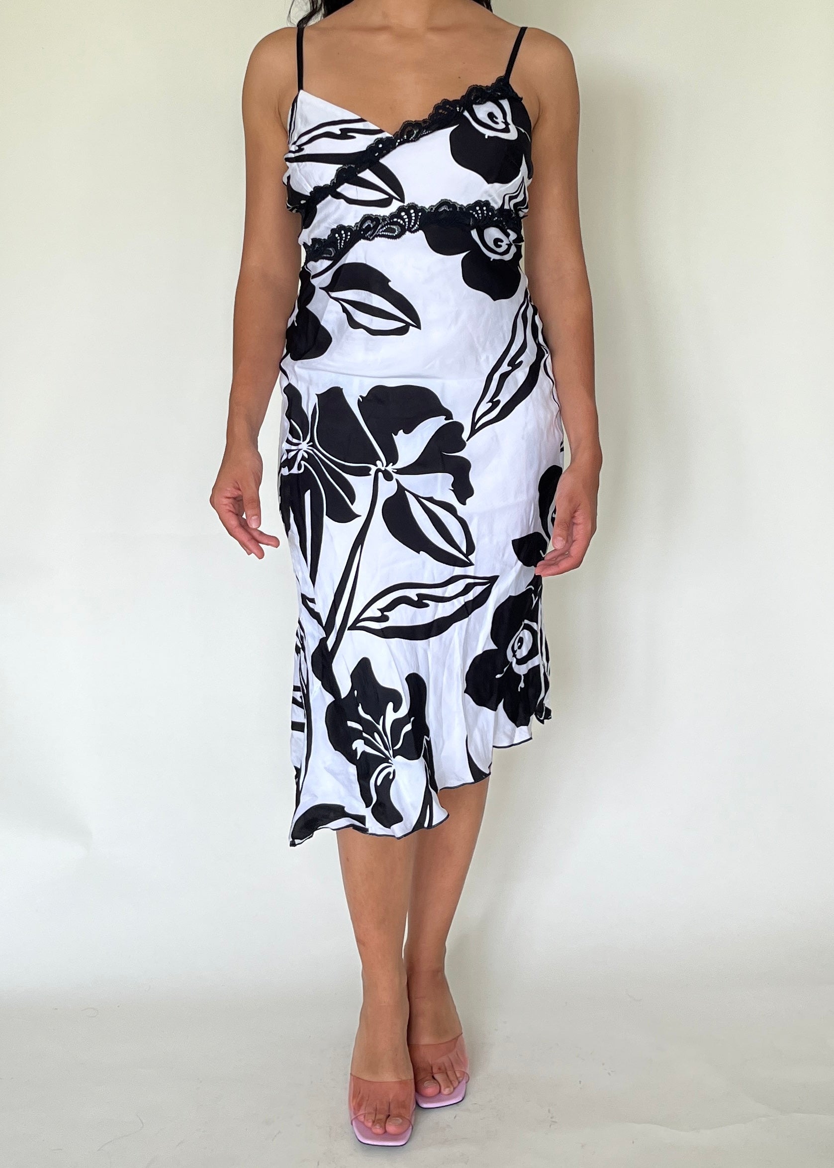 Robe longue asymétrique imprimé fleuri noire et blanche