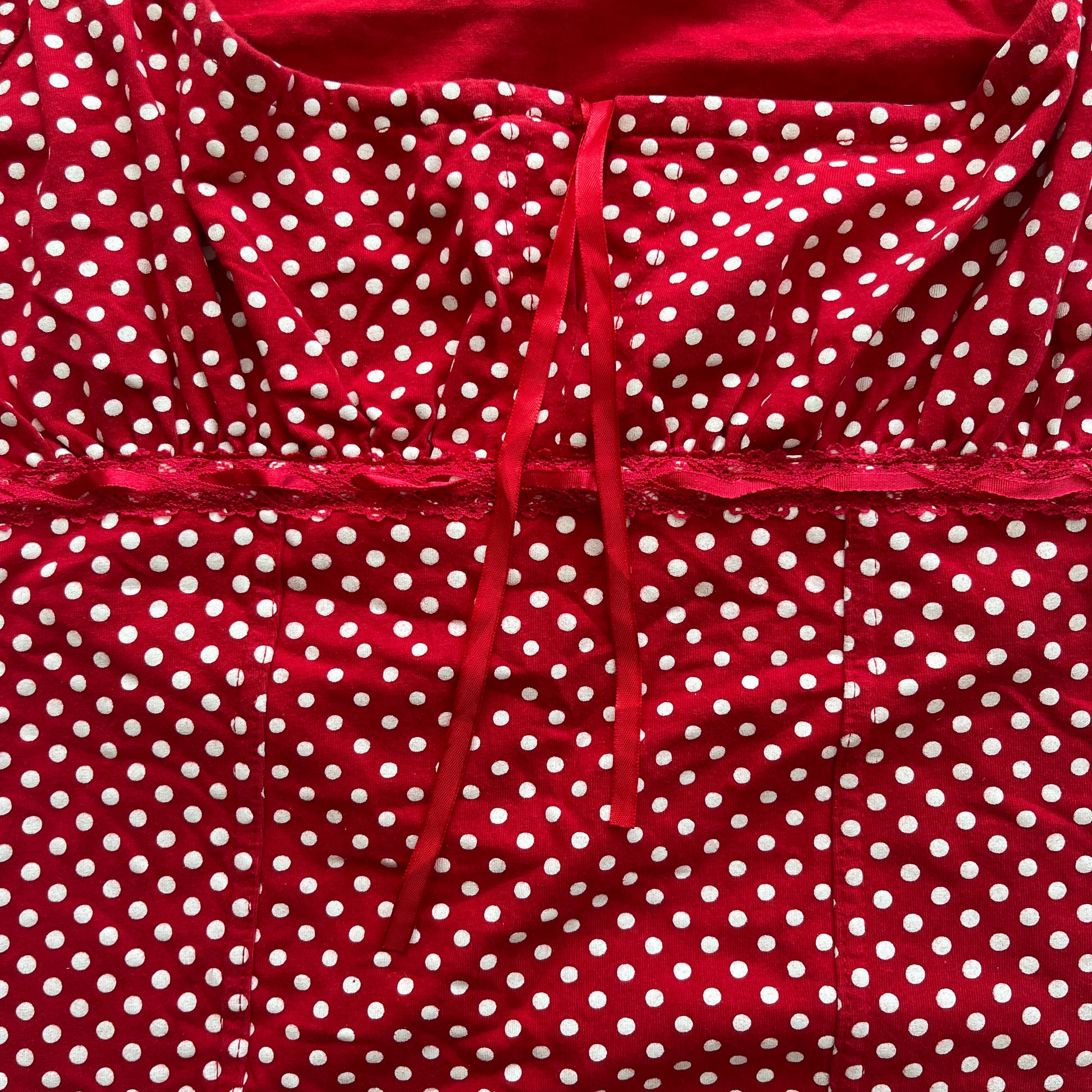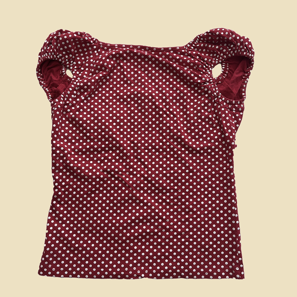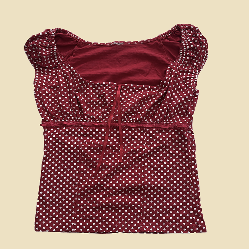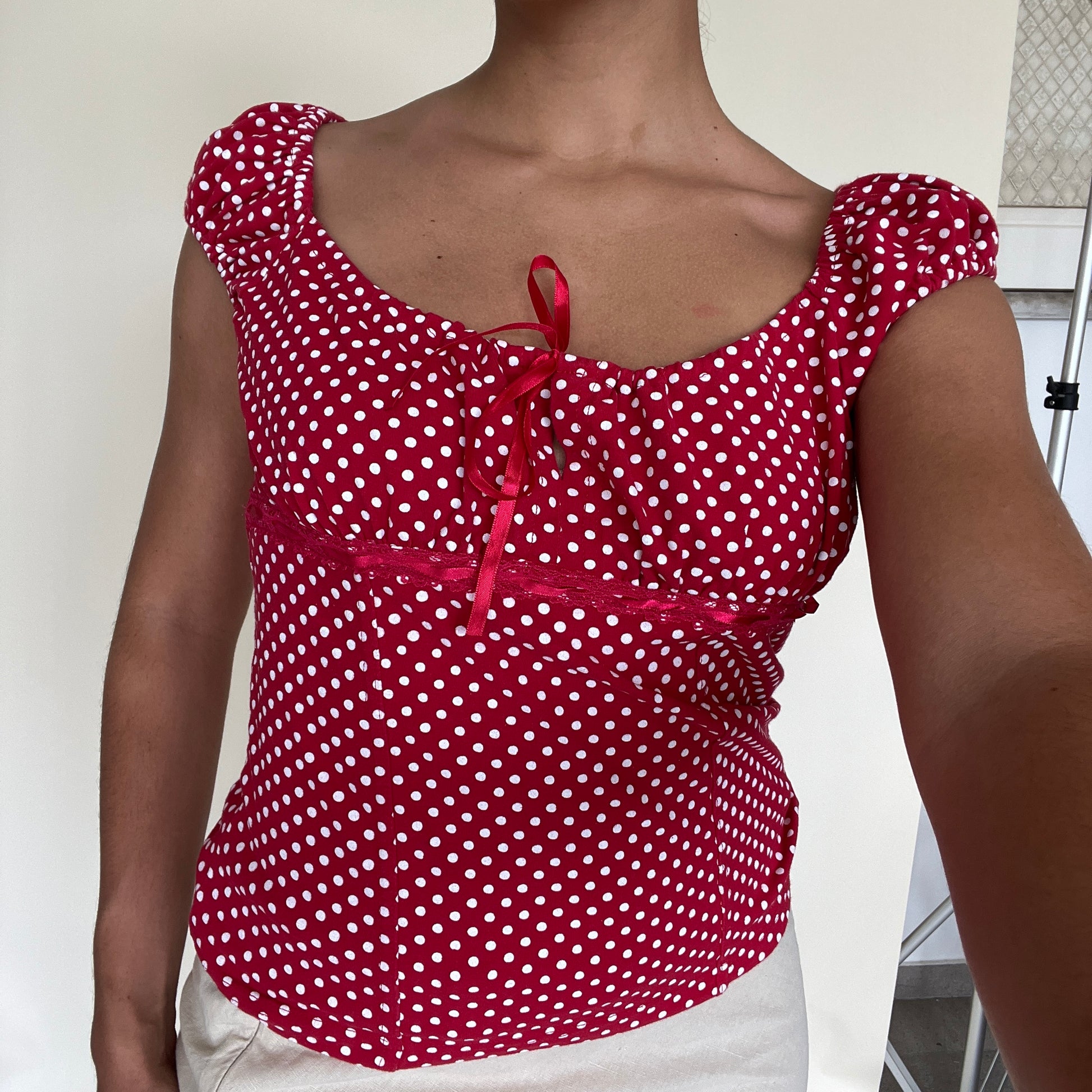 Haut épaules dénudées polka dot rouge. Encolure carrée.