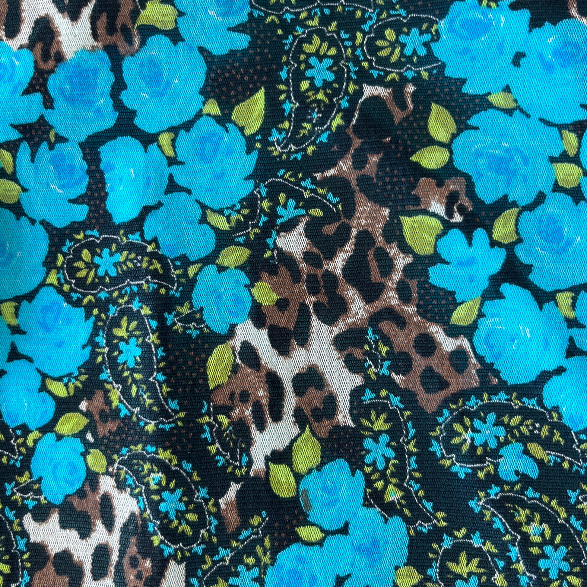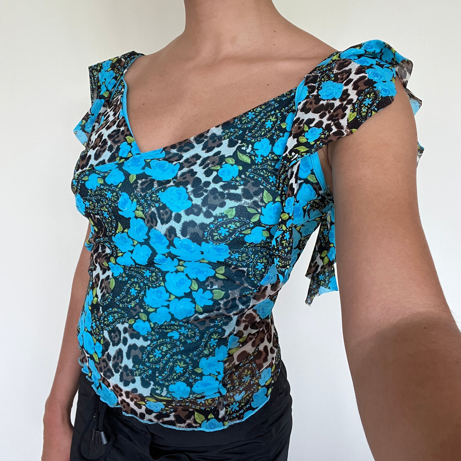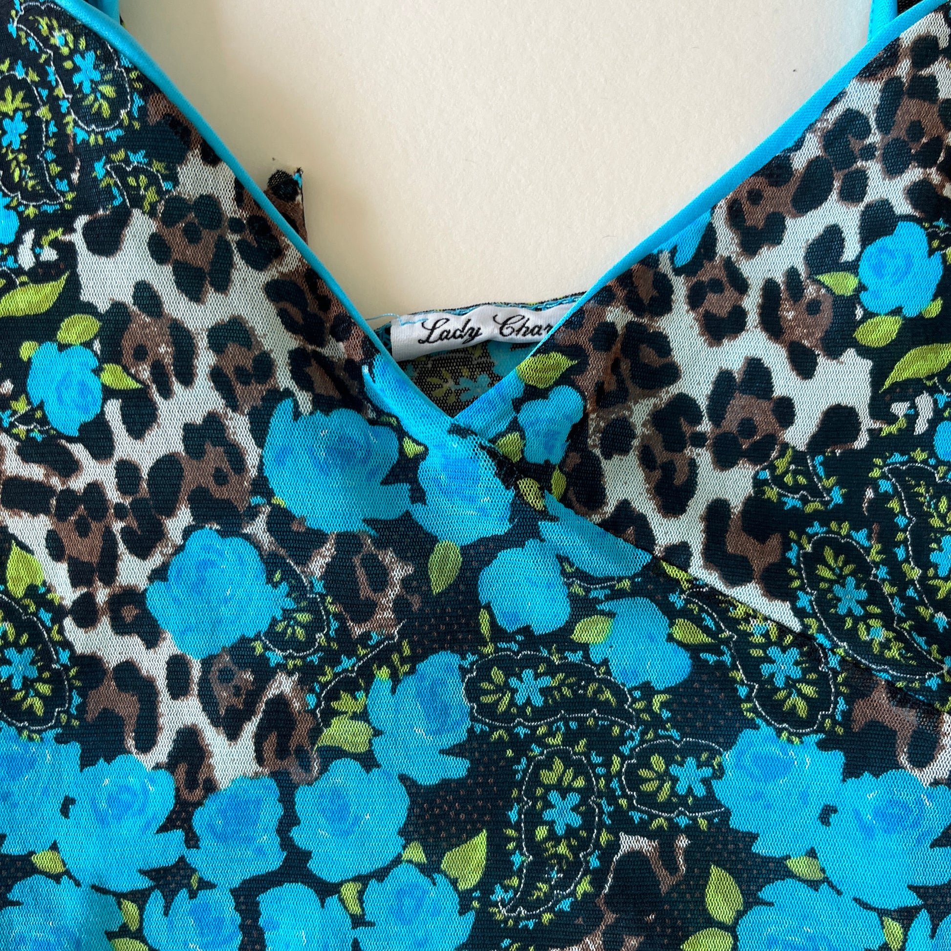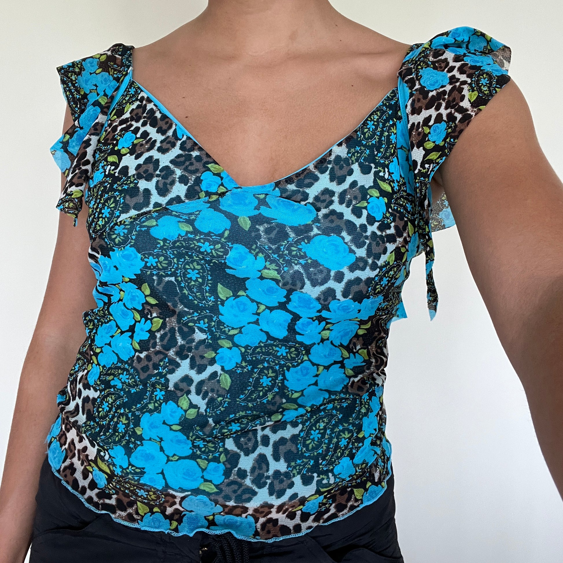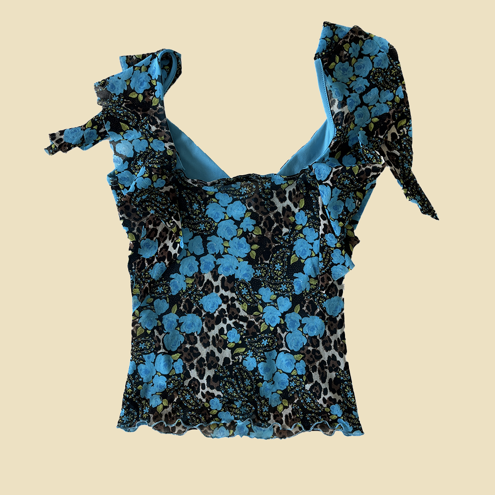 Haut en mesh turquoise à motif fleuri et animal.